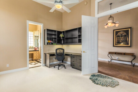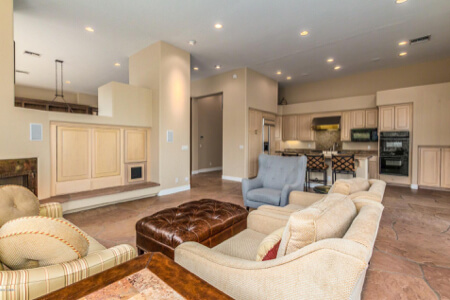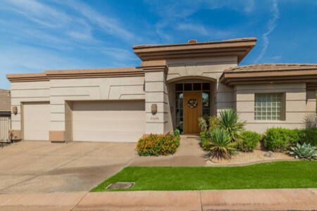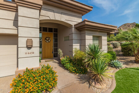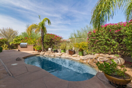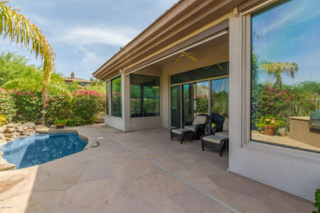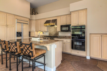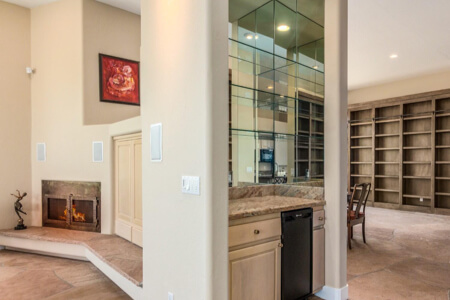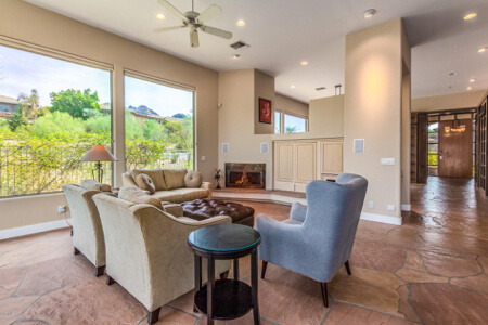 Perfect for all ages! Immaculate 3 bedroom, 3 bathroom, 3 car garage home – coveted Biltmore location with mountain views and vibrant desert landscape! Fourteen foot ceilings throughout and natural fossilized stone flooring. Custom built floor to ceiling bookcases add warmth and sophistication to the library, living and dining areas. Entertain with a built-in bar and fabulous great room with gas fireplace or sunset views. Chefs' kitchen is fully equipped with granite tops, professional gas stove, wall ovens, built-in fridge and breakfast bar! Master suite is huge with spa-like full bath, w.i. closet, office area and walkout to oasis patio with built-in gas grill, spa pool, and landscaped privacy! Large executive den/guest suite has full ensuite and built-in work area. Convertible, More...